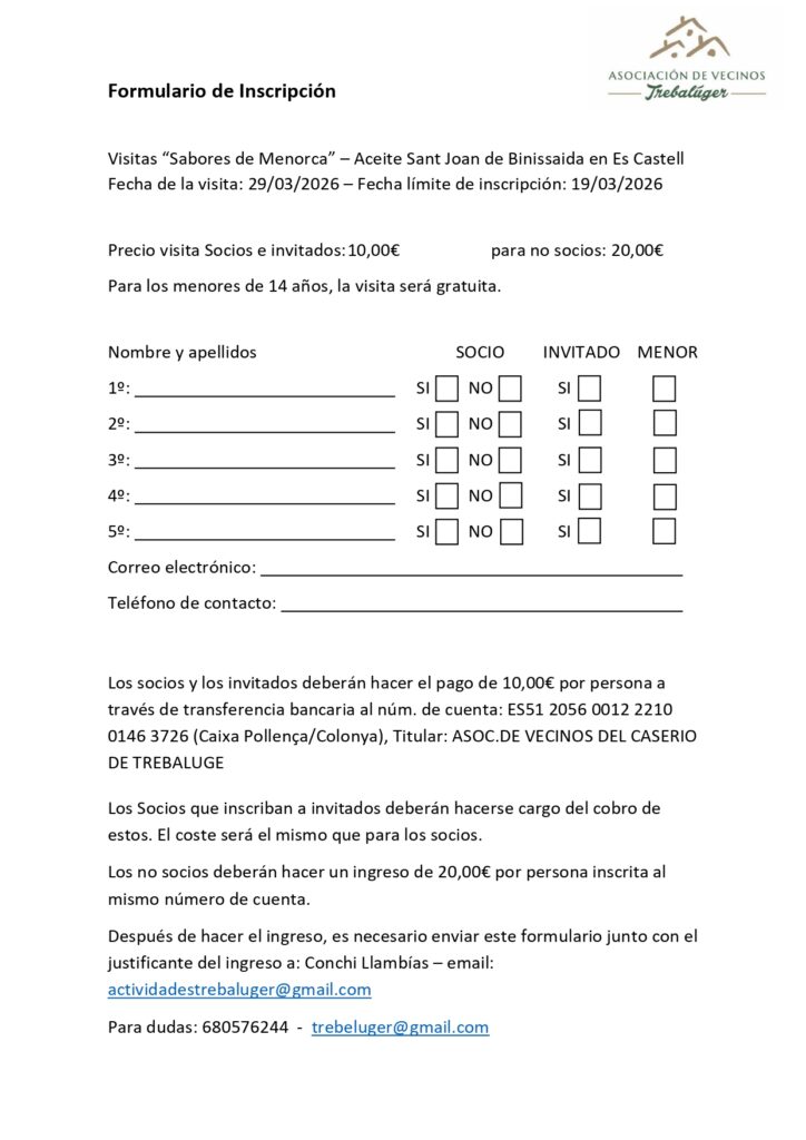 Binissaida tour registration form